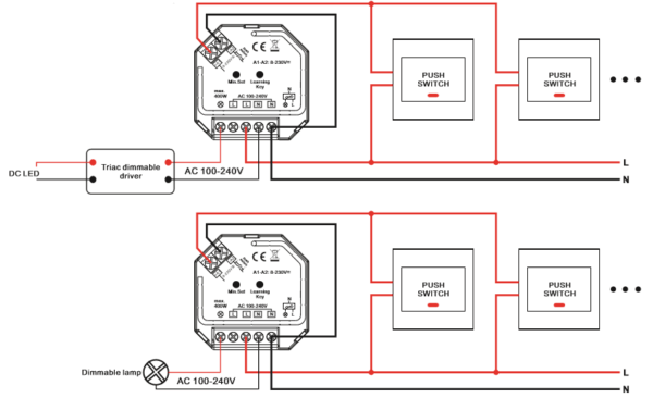 Deze draadloze led dimmer kan worden gemonteerd in een elektra inbouwdoos, lasdoos of zelfs in een lamp of armatuur en kan met een pulsdrukker van elk merk schakelmateriaal worden toegepast. Tevens kunt u deze 230V led dimmer afstandsbediening (de naam zegt het al) bedienen met een draadloze RF remote welke u er als optie bij kunt selecteren. U kunt ook meerdere pulsdrukkers en afstandsbedieningen tegelijk gebruiken om 1 dimmer te bedienen, zo kunt u op meerdere plekken in en uitschakelen en dimmen! Deze draadloze 230V led dimmer dimt alles wat dimbaar is tot een vermogen van 200W aan led en 400W als u hem voor gloeilampen gaat gebruiken.