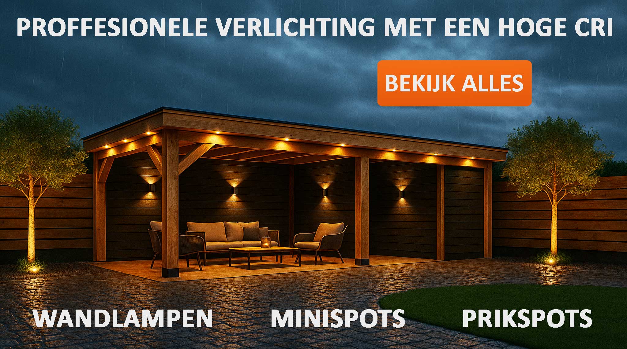 Voor uw overkapping, veranda of carport bieden we inbouwspots, opbouwspots en wandlampen. Onze dimbare VLK LED-spots (2700K, CRI 93) zijn eenvoudig te installeren en perfect voor sfeervolle of functionele verlichting.